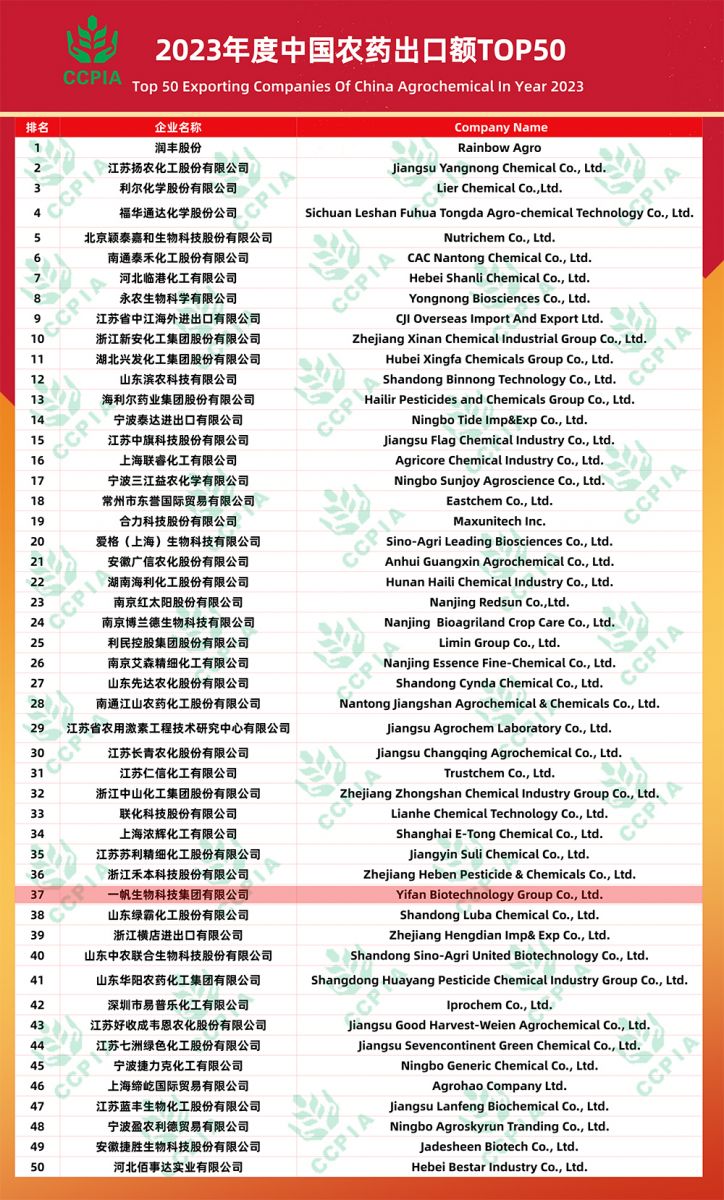 喜报!一帆荣登2023年度中国农药出口额TOP50榜单 |